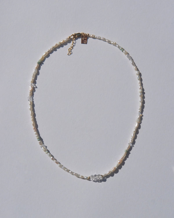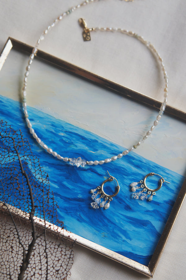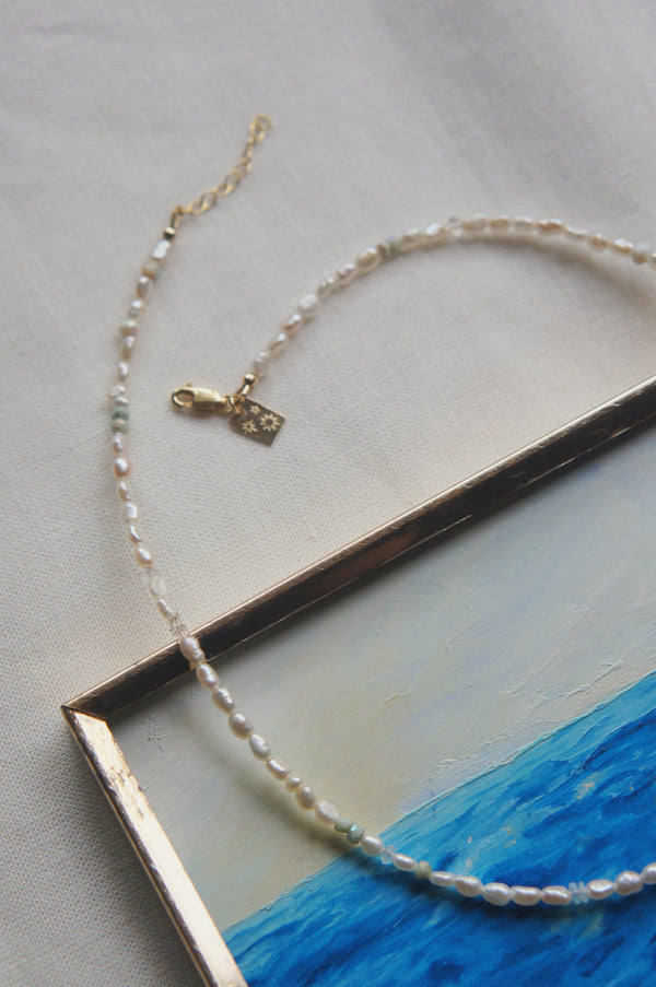 Means “pearl”. All the ocean inspired gems collaborate in this beaded beauty. Wear alone or pair with your favorite dear ocean necklaces for the perfect necklace stack.